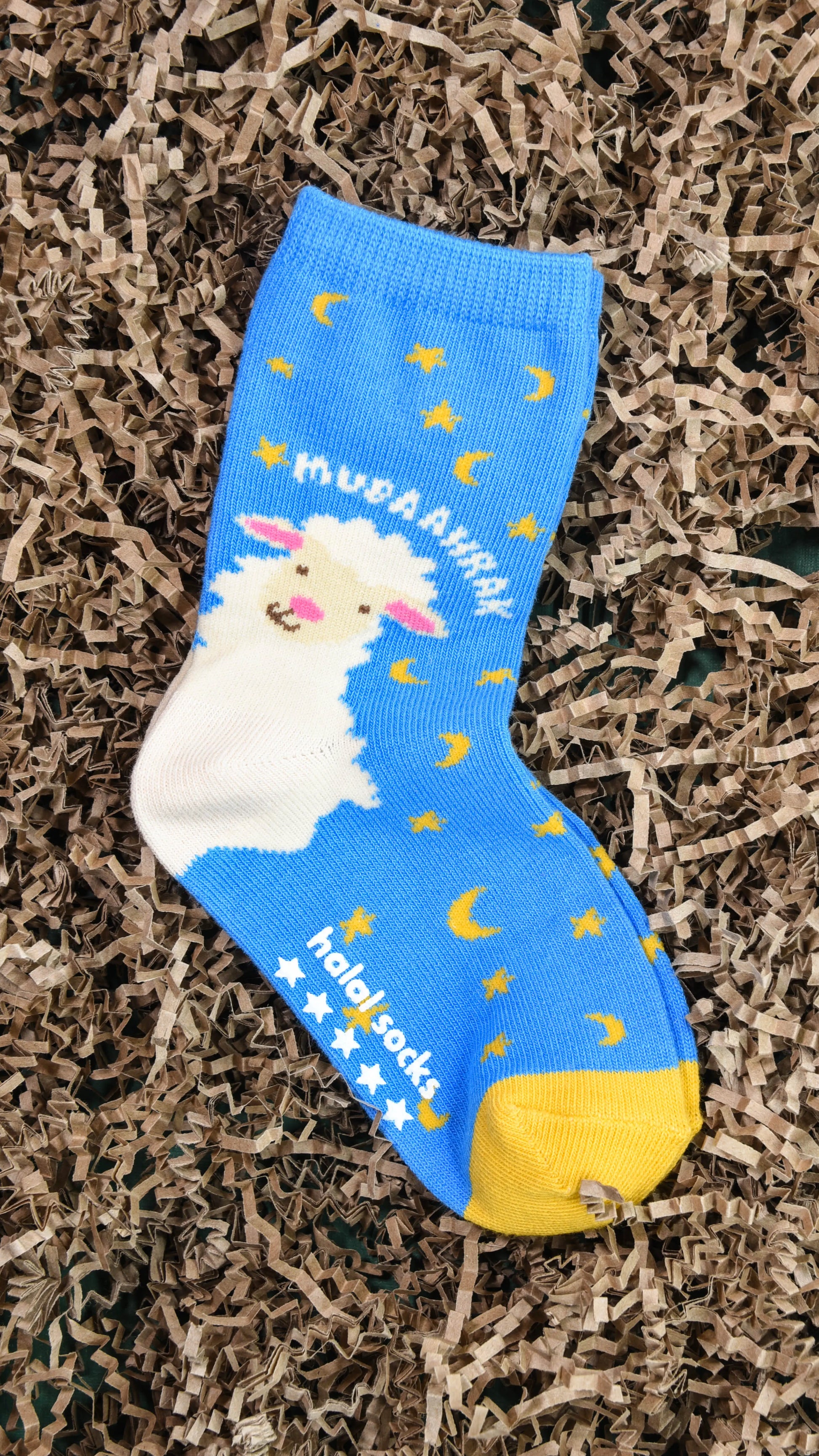 These socks are perfect for your little ones! They feature a playful sheep peeking from the heel and the words "Mubaaahrak", adding a touch of excitement to their outfit. With stars, presents, and a bright yellow toe, these socks are both fun and comfortable.